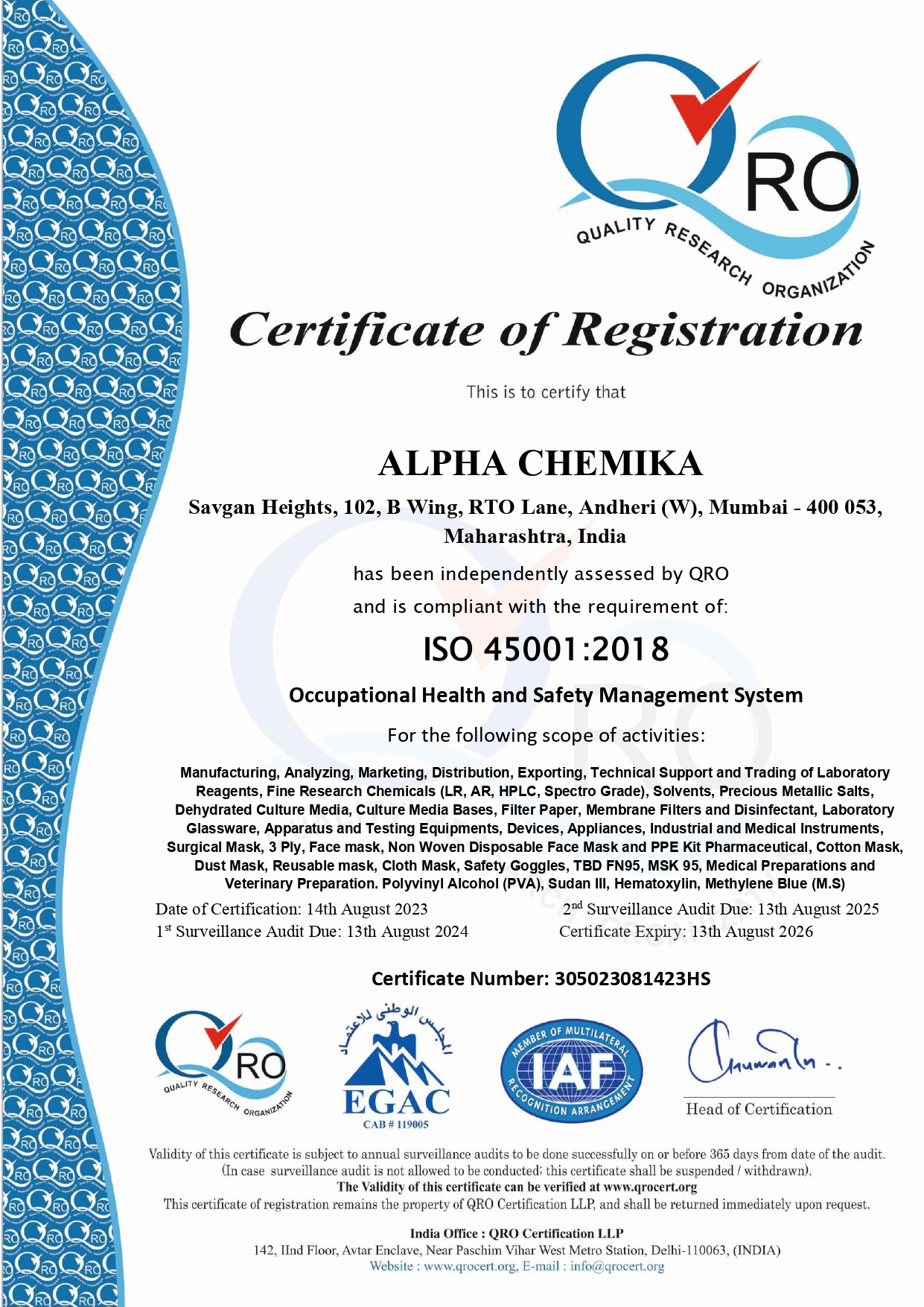 Alpha Chemika has prompt delivery on any size of order Delivery one week for any qty of order. 100% guarantee for all deliveries Our network enables us to deliver your shipment on right time. Stock / Inventory is maintained keeping your immediate requirements in mind.
